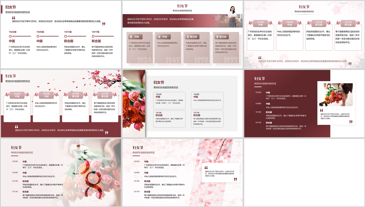 一页PPT中有4段文本,这样的内容是大家遇到的最多类型的PPT了。马上快到三八妇女节,今天我们就修改一页妇女节主题的PPT,改造出8种风格。