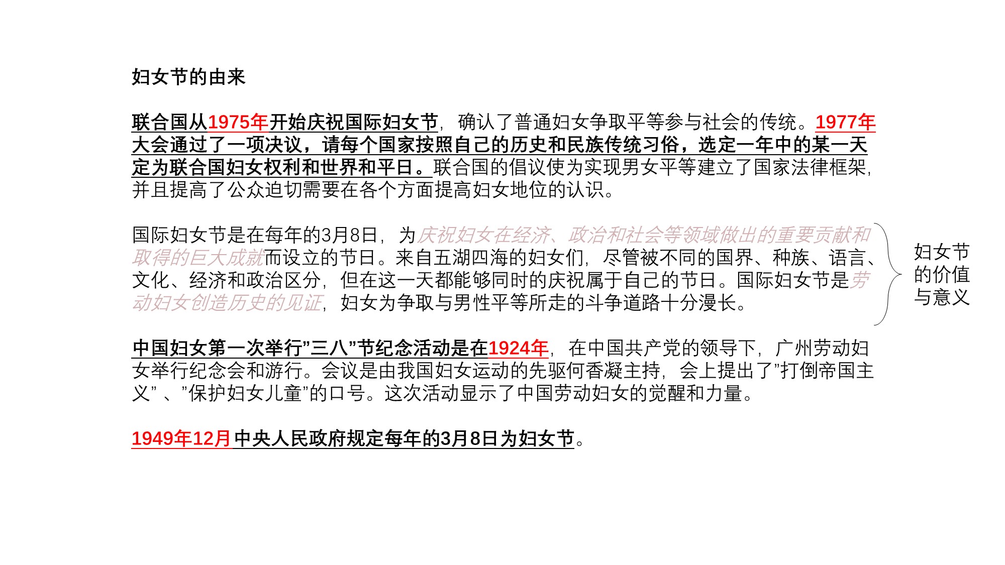 提取出原始内容,仔细分析一下,可以看到第二段主要讲述了妇女节的价值与意义。其它三段讲述了妇女节庆祝的4个时间点。