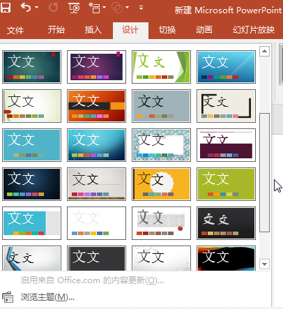 在【设计】中,找到主题,直接套用,PPT就不会显得那么单调了。