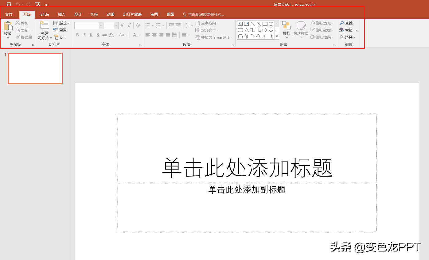 可以看到,红色框线中的,就是PPT的功能栏。包括“开始”、“插入”、“设计”、“切换”、“动画”、“幻灯片放映”、“审阅”、“视图”。