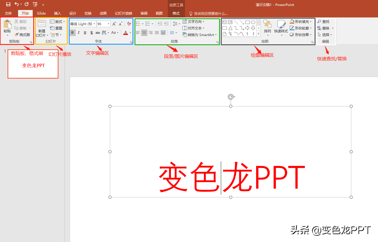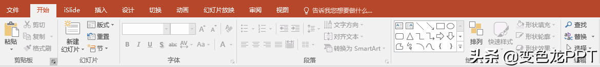 开始栏中的各项功能如上图所示。可以看到,有很多的功能,是灰色显示,代表此项功能暂时不可用,这些功能是需要选定PPT中的元素之后,才可使用。