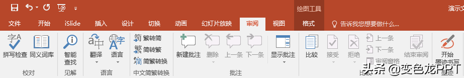 对PPT中的素材进行拼写检查,繁体简体字转换,批注等。在“审阅”中需要介绍的功能只有一项,就是“文档加密”。可以对PPT进行密码加密,保证文档安全。