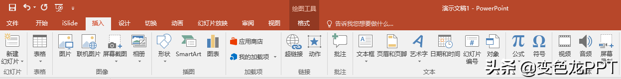 顾名思义,利用这项功能,可以插入任何你想放在PPT中的素材。包括表格、图片、形状、文本框、艺术字、公式、符号、页眉页脚、日期时间、音视频、超链接、动作设置等。和“开始”一样,“插入”中的功能也需要全部掌握。