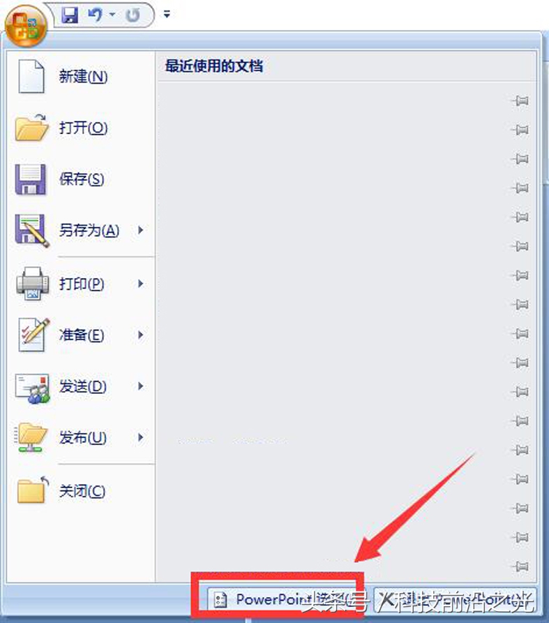 1、打开之前出问题的ppt文件,然后在ppt左上角点击鼠标左键,打开文件设置按钮,打开ppt文件设置菜单,在里面找到“PowerPoint选项”按钮,点击该“PowerPoint选项”按钮,打开选项设置页面。