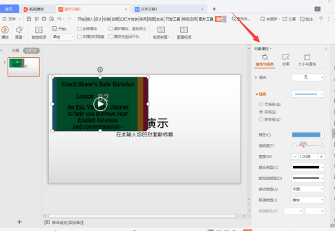 2.在PPT右侧,弹出“对象属性”,点击“填充与线条”,可以设置视频边框的填充效果和线条