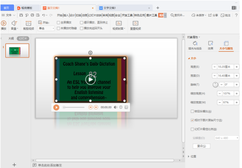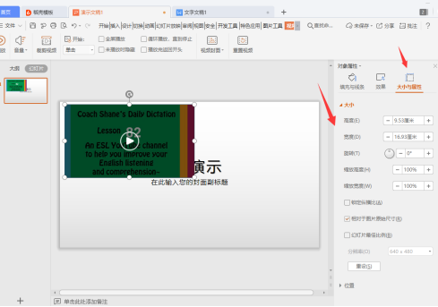 4.点击“大小与属性”,可以设置视频的大小、位置等
