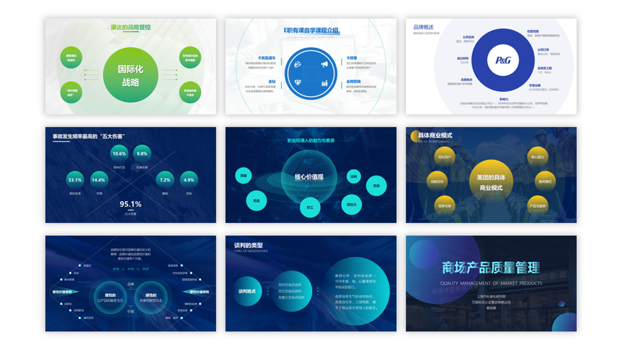 再比如这种之前分享的PPT页面,将圆形使用中心渐变的方法处理。