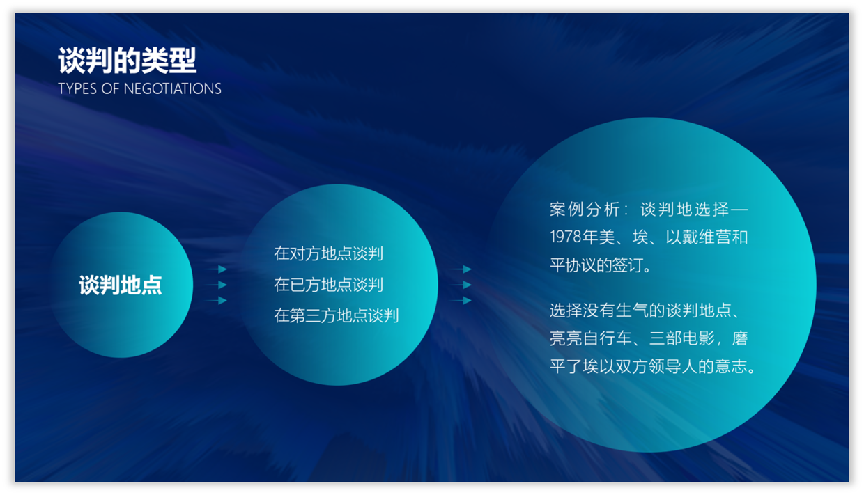 除此之外,如果PPT内容结构比较复杂,那么使用圆形形状设计,能很好的规整一下。