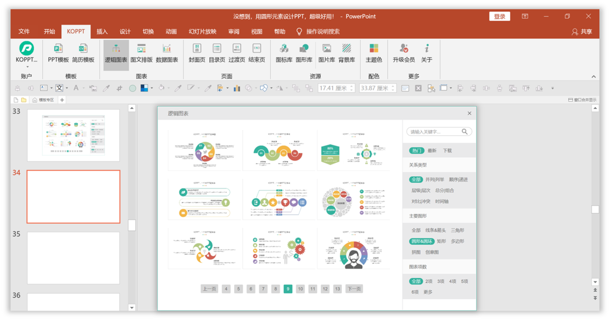 关于这种创意的圆形逻辑图表,在【KOPPT】插件中也可以获取,直接选择圆形分类即可。