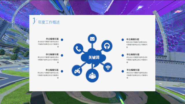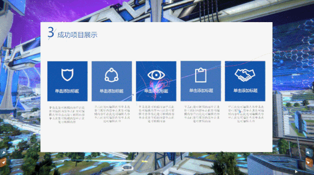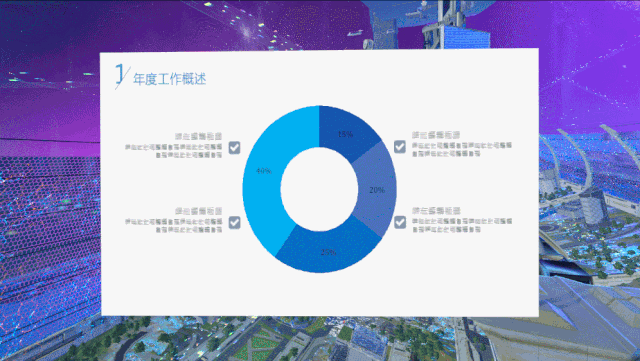 拥有一定基础的PPT设计者,会花大量的时间精力去设计转场动画,花了一整天,终于做出了如下效果,但还停留在2D平面。