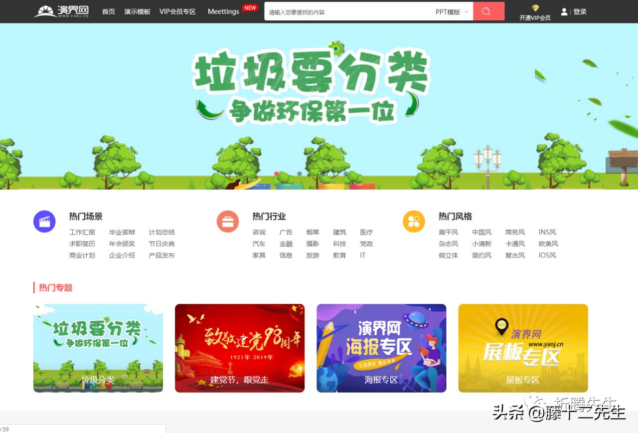它的界面分为:演示模板、VIP会员专区、热门场景、热门行业、热门风格、热门专题、VIP专区、keynote模板、AE模板、推荐设计师等目录。