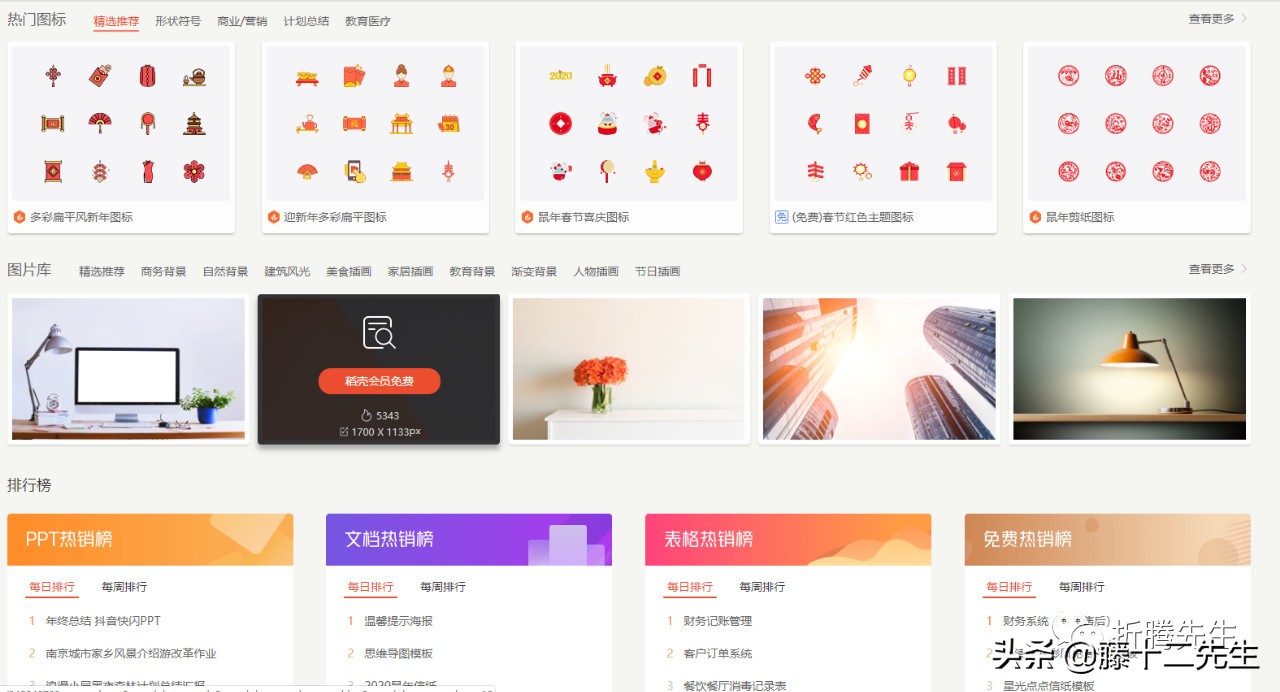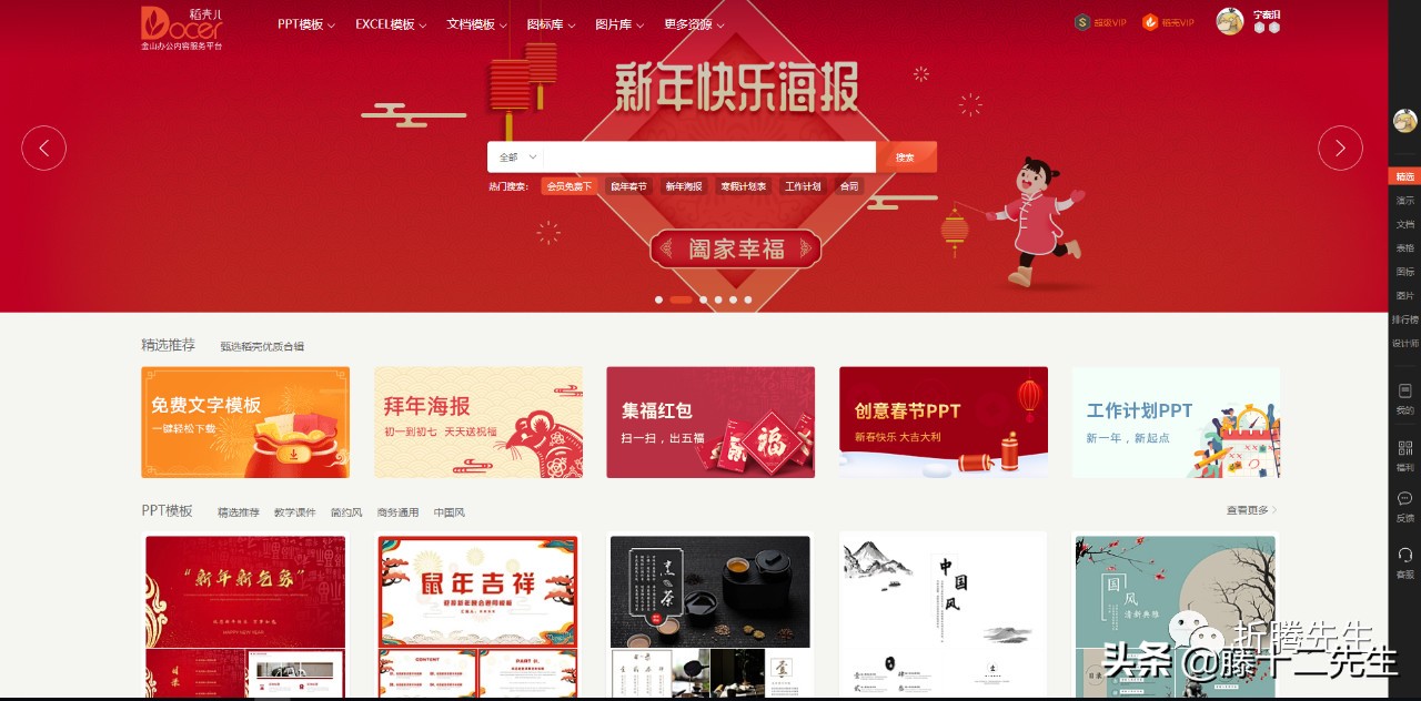 首先它的设计风格非常美观大方,而且分类非常的详细明了,分为PPT模板、EXCEL模板,文档模板、图标库。图片库和更多资源,我们在这直接找到自己想要的内容。