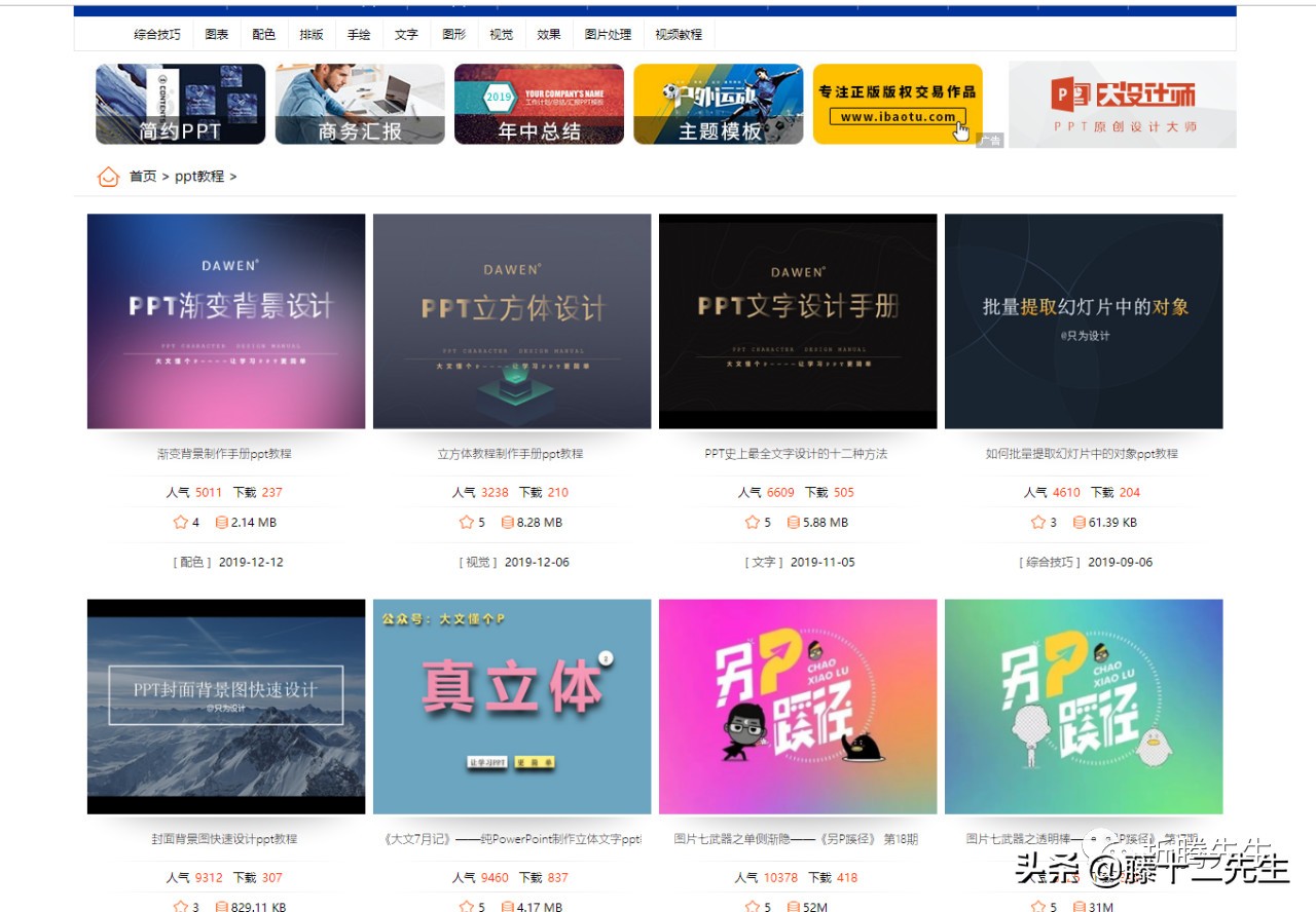 因为这个网站是老网站,我们可以在里面可以找到很多优质的教学教程,比如:PPT渐变背景设计、PPT立方体设计、PPT文字设计手册、批量提取幻灯片中的对象、背景透明png图片描边的PPT等等一些优质教程,我们都可以在上面找到。