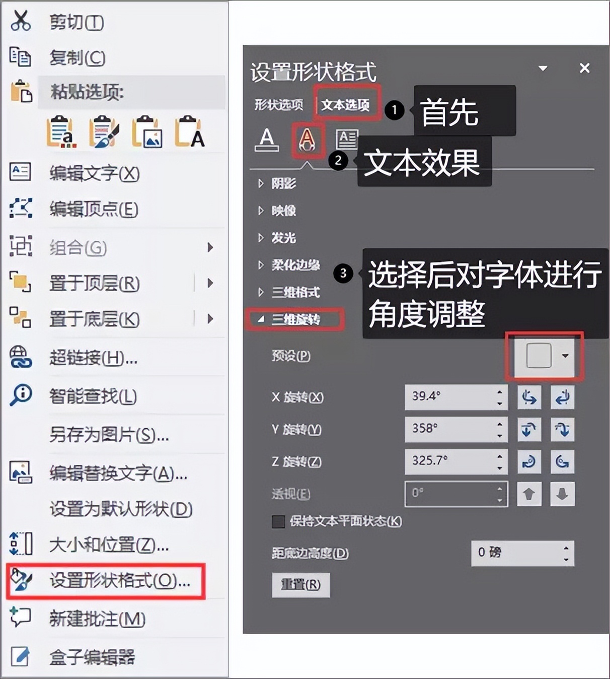 选中文字位置右击选择设置形状格——文本选项——文字效果——三维旋转,对文字角度进行调整也可以在预设中进行设置。根据PPT文本效果对文本角度进行调整。
