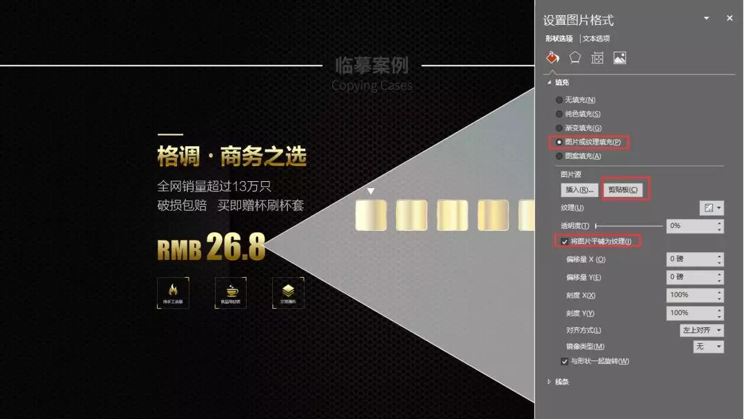 将金属纹理选中复制,右击设置图片格式——图片或纹理填充——剪贴板——将图片平铺为纹理。