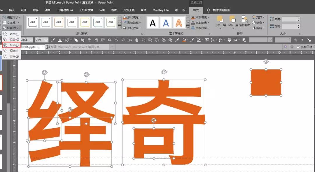 PPT中拆分字的实现是通过布尔运算来完成的,通过色块和文字之间的拆分运算就可以将文本拆分成一个又一个的形状。选中文字与色块——格式——拆分。