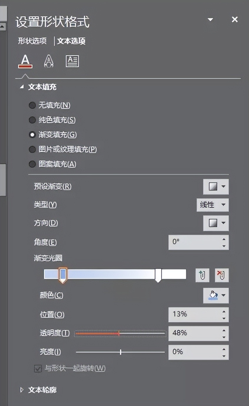 选中文本框,右击选择设置形状格——文本选项——文本填充与轮廓——渐变填充,这里需要对角度、进行细节调整与渐变光圈的添加。