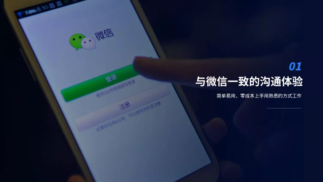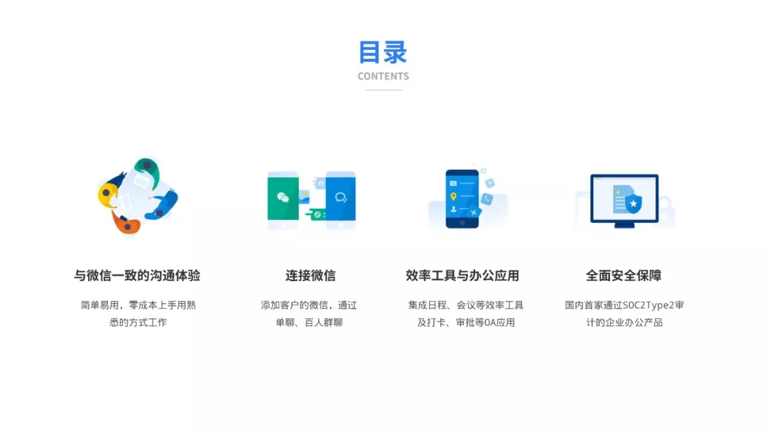 上面这张PPT则采用了上下布局的版式,上面部分是简短的文字介绍,下面是企业微信聊天的界面。