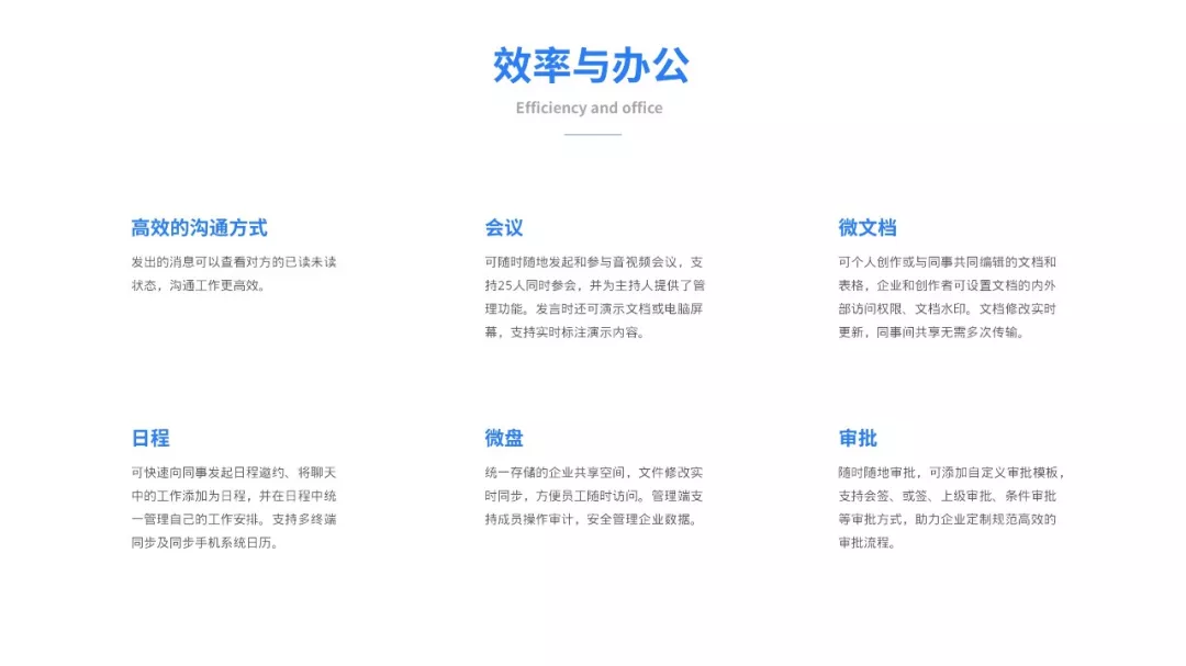 上面这张PPT采用了并列式的版式结构,将6个功能特性,通过六个板块进行呈现。