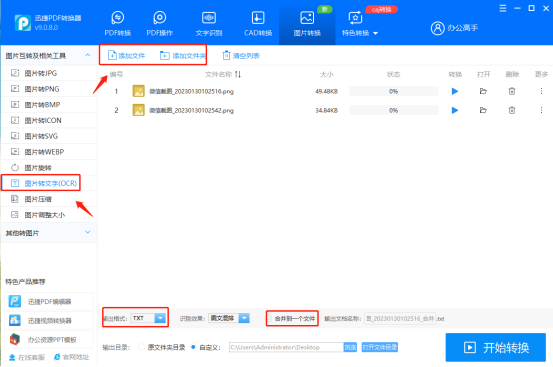 2、文件添加进去后,如果文件较多可以直接添加文件夹,选择好输出格式,直接点击“开始转换”。文字会自动生成记事本保存在电脑里,直接查看即可,转换效率很快速。