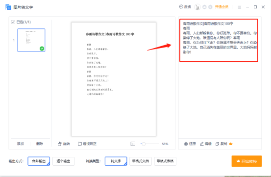 没问题直接点击“开始转换”,就可以将图片中的文字提取出来了。