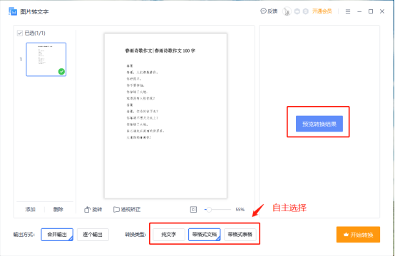 跳转到新界面后,可以自主选择输出格式:纯文字、带格式文档、带格式文档。根据图片直接勾选后点击“预览转换结果”可以初步进行一个查看。