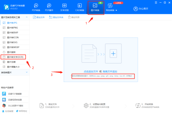 1、先打开软件,点击“图片转换”,在左侧找到“图片转文字(OCR)”功能,迅速将目标图片上传至指定区域内。