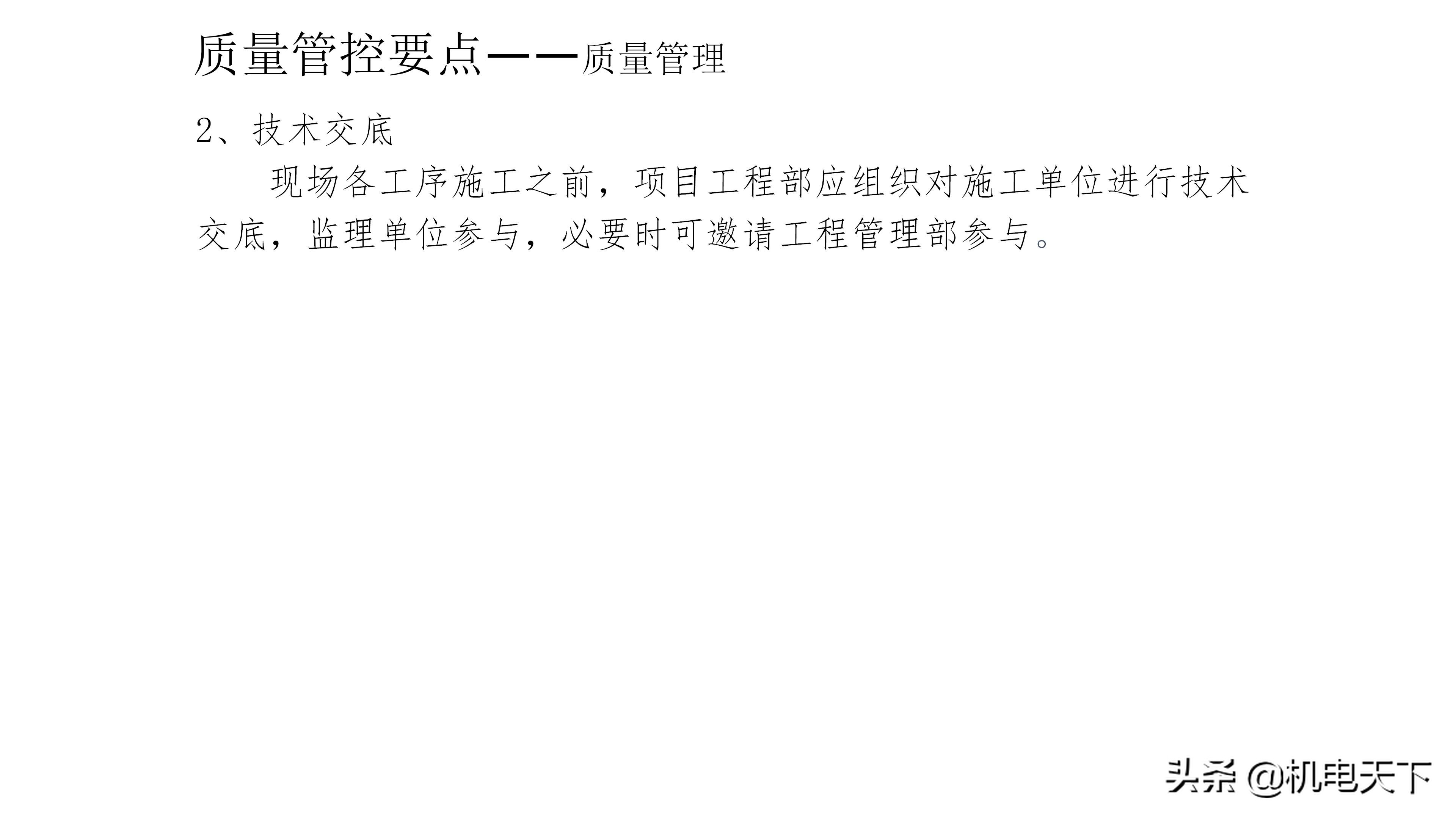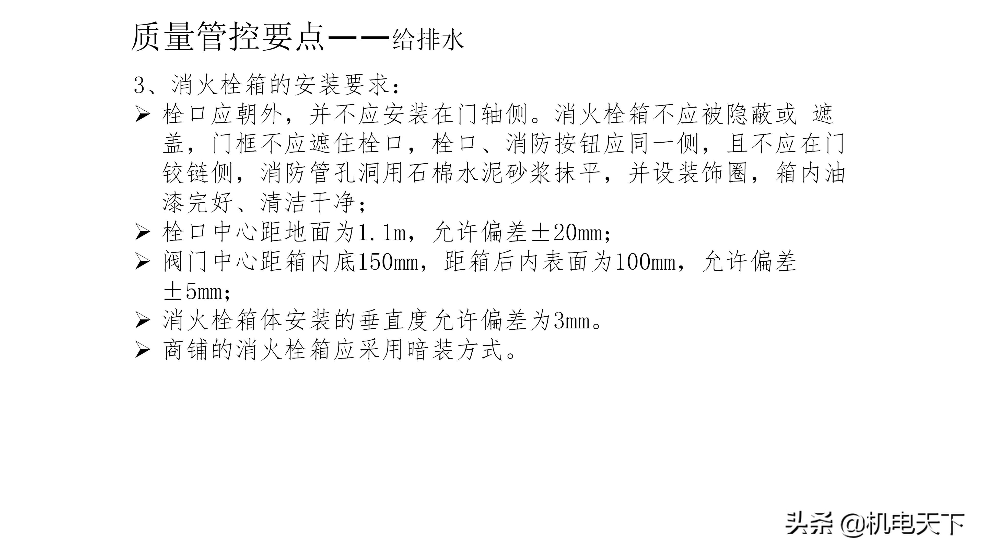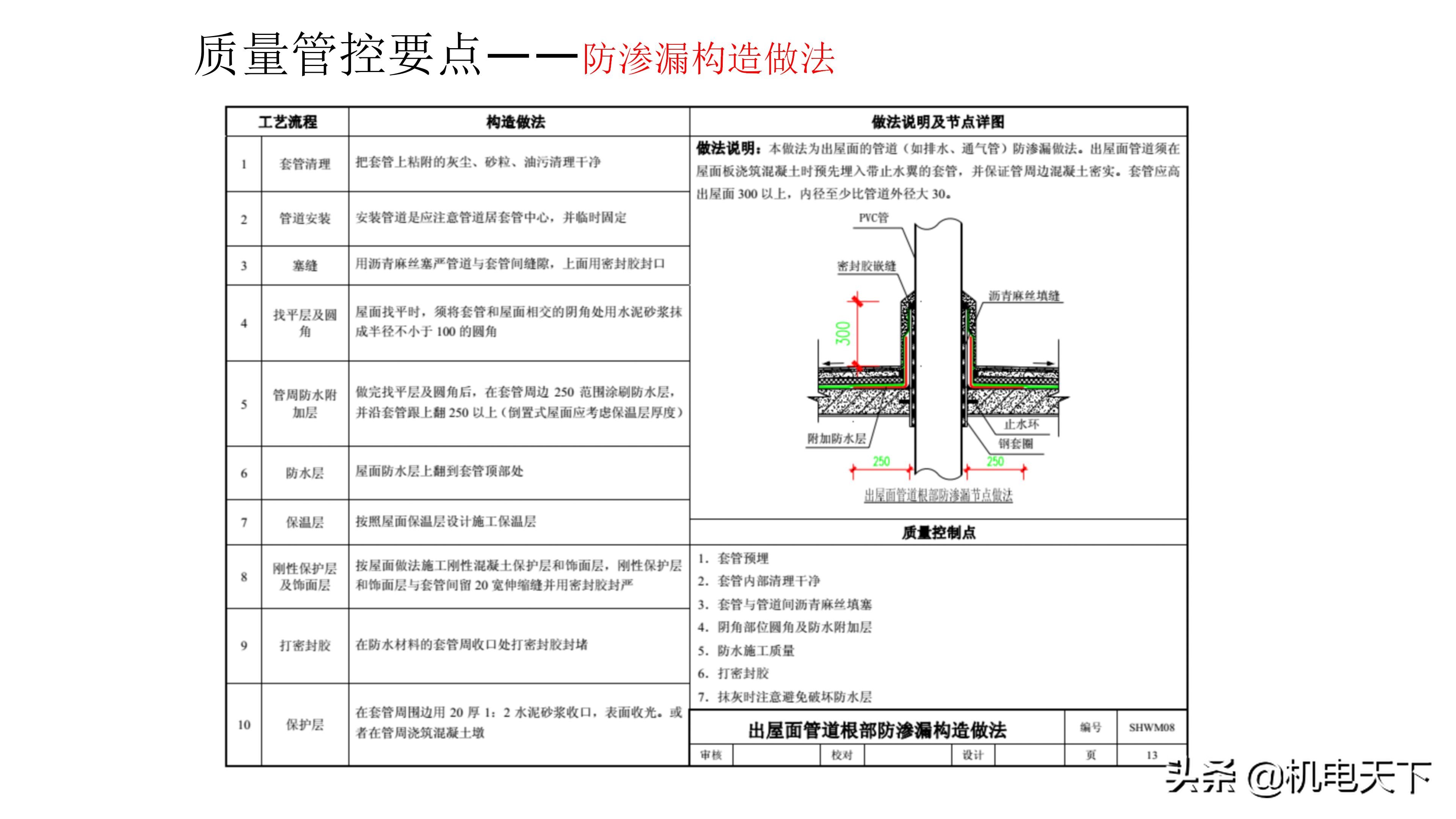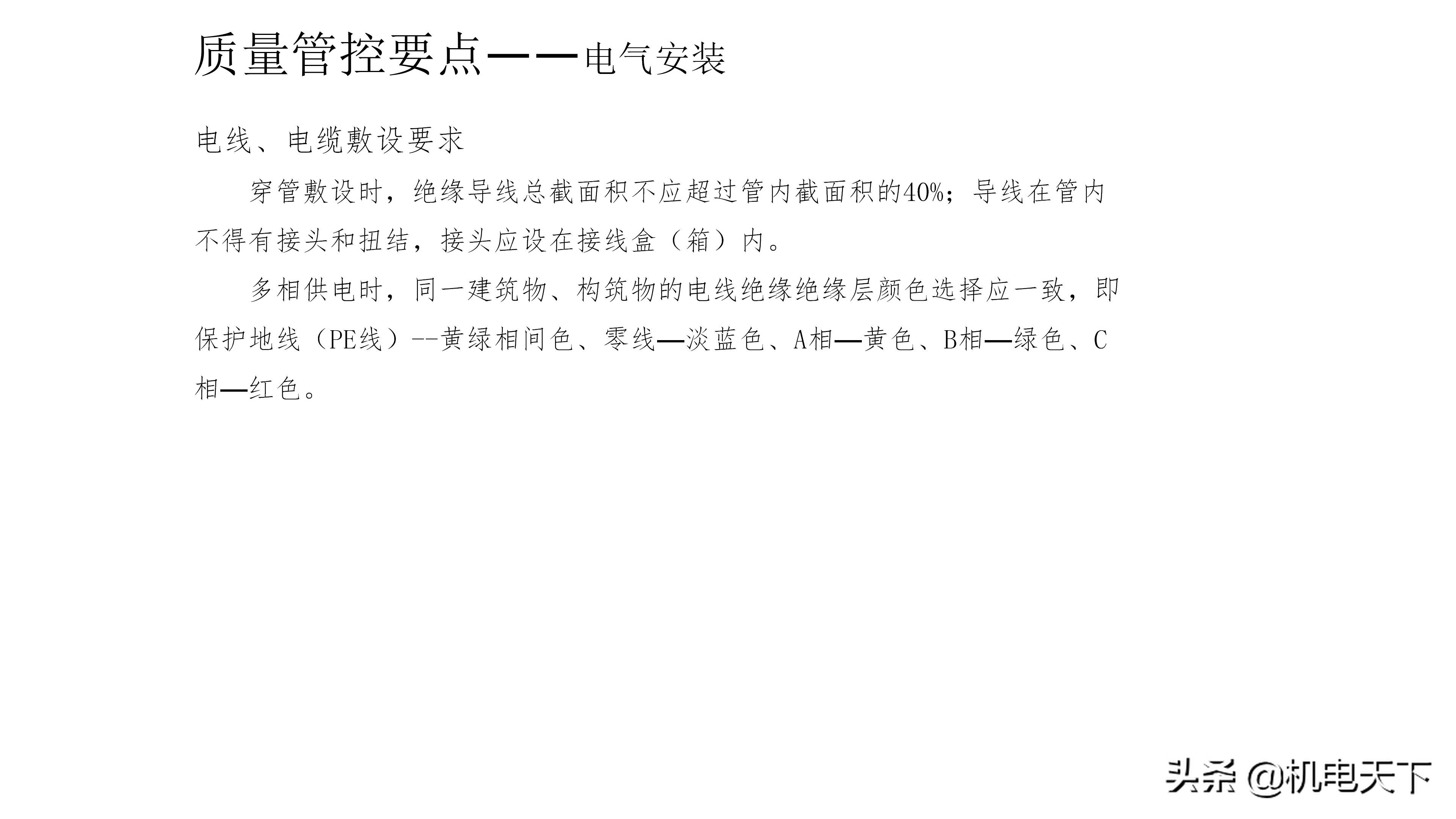 1.关注本号,私信回复:vip,获取加入机电天下永久vip方式一、常见质量问题及优秀做法1、电气安装 2、给排水管道二、安装工程质量管理1、图纸审核 2、技术交底 3、样板点评 4、实测实量 5、监督检查6、质量锤 7、重大质量风险点 8、工程材料 9、禁止做法 10、防渗漏构造做法