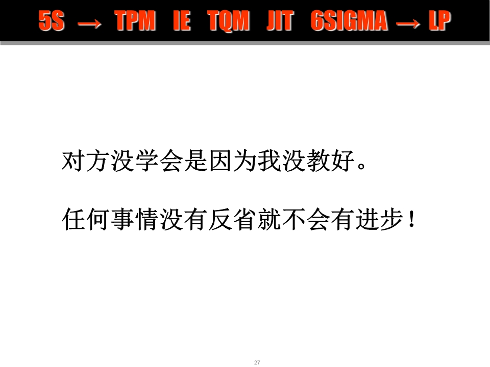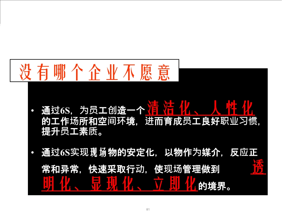3.我们要注重现场管理的实施与落地,执行5S现场管理,提高效率、降低人员成本、减少缺陷率,将改进流程作为不断优化的过程,积极推广、培训和普及精益思想,并在不断的实践中探索出适合企业的最优解,以提高企业的核心竞争力和市场占有率。