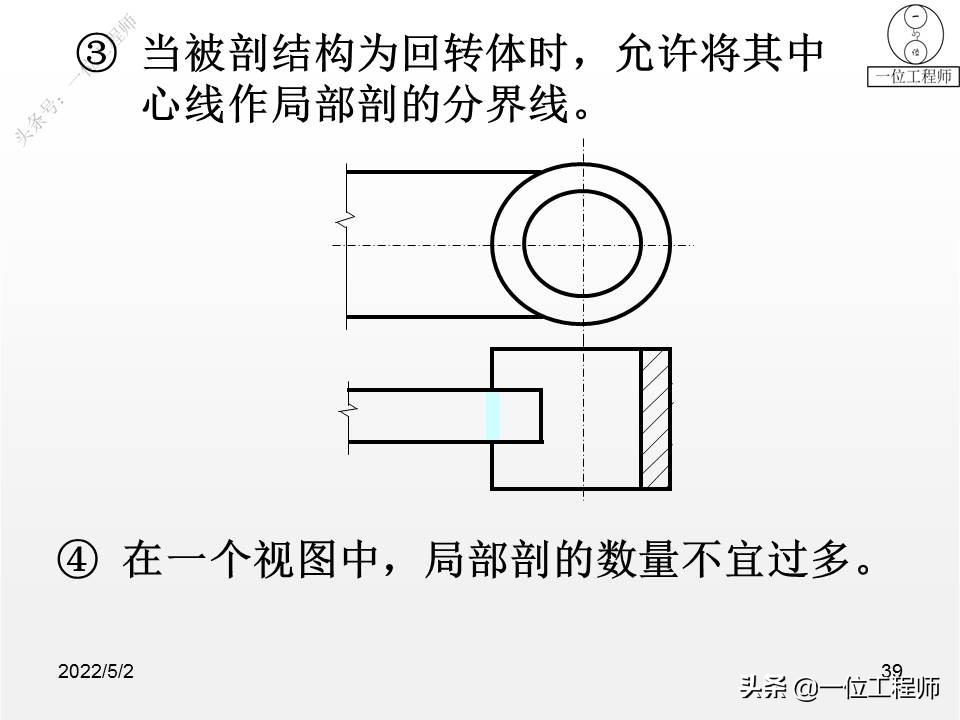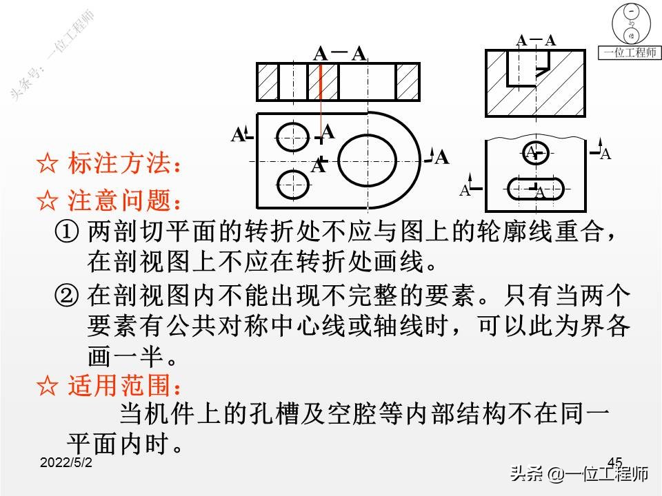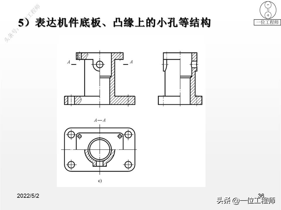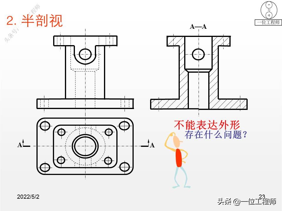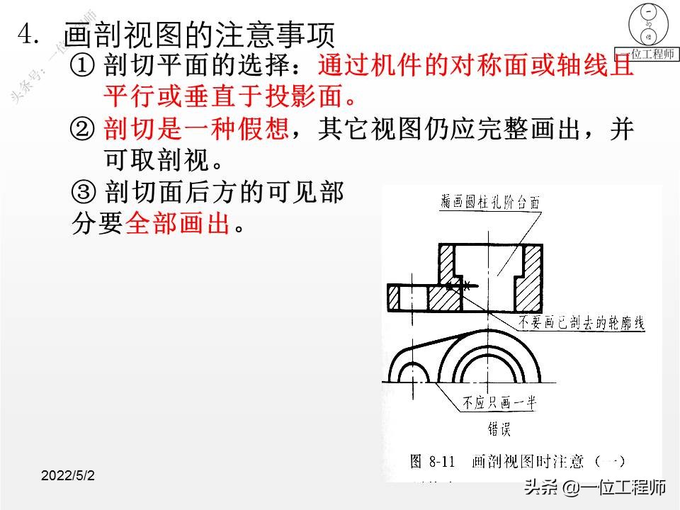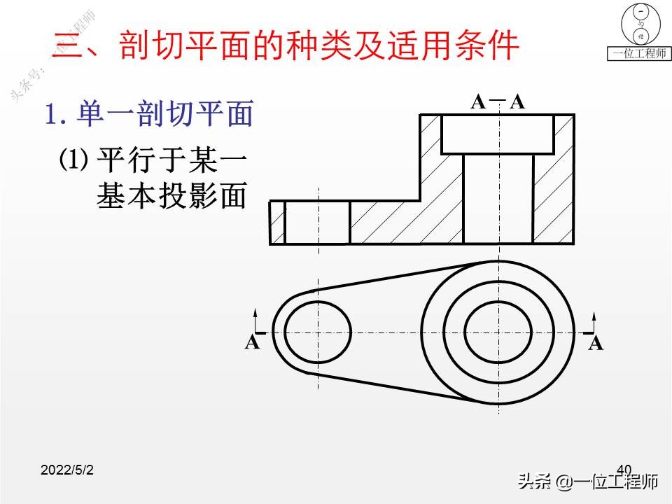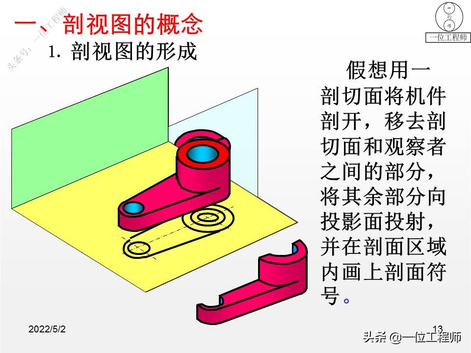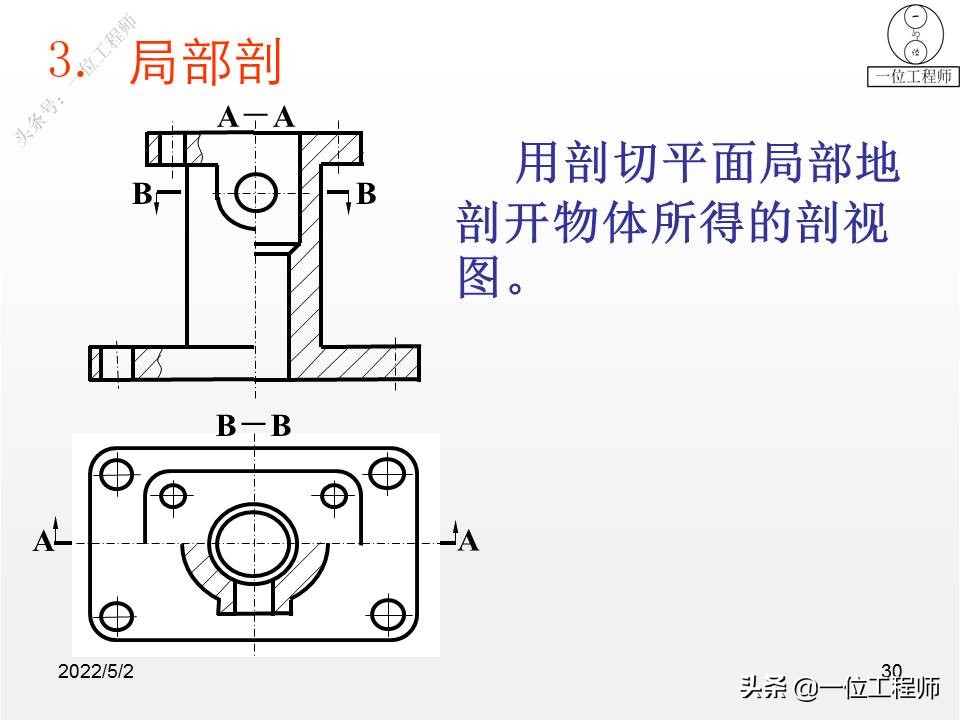 剖视图:假想用一剖切面将机件剖开,移去剖切面和观察者之间的部分,将其余部分向投影面投射,并在剖面区域内画上剖面符号。