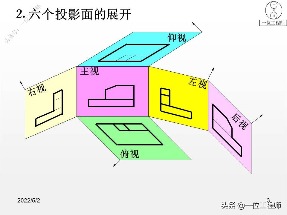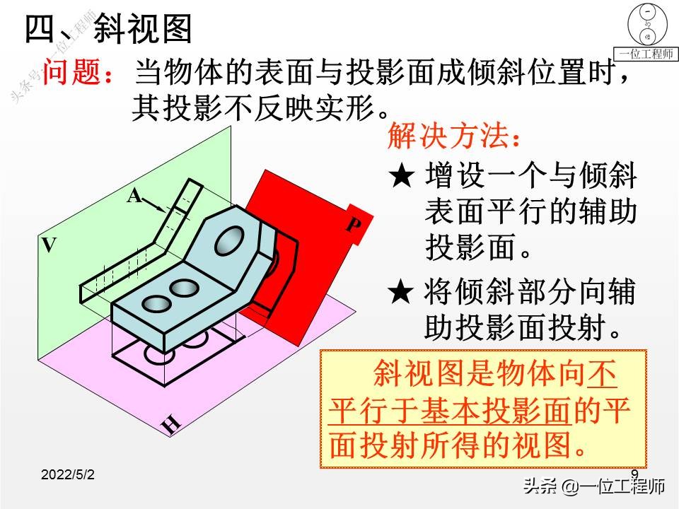 基本视图由主视图、左视图和俯视图组成。有时为了便于合理地布置基本视图,可以采用“向视图”。局部视图是将物体的某一部分向基本投影面投射所得的视图。斜视图是物体向不平行于基本投影面的平面投射所得的视图。