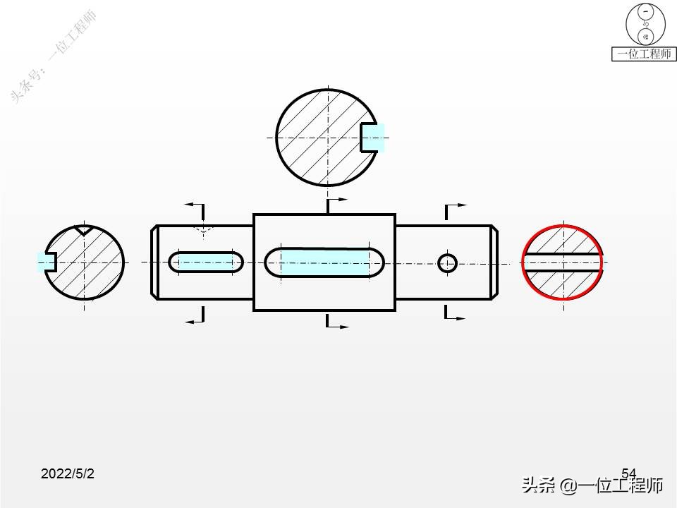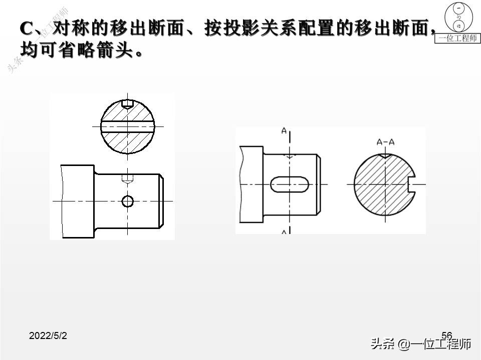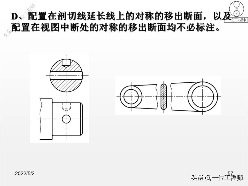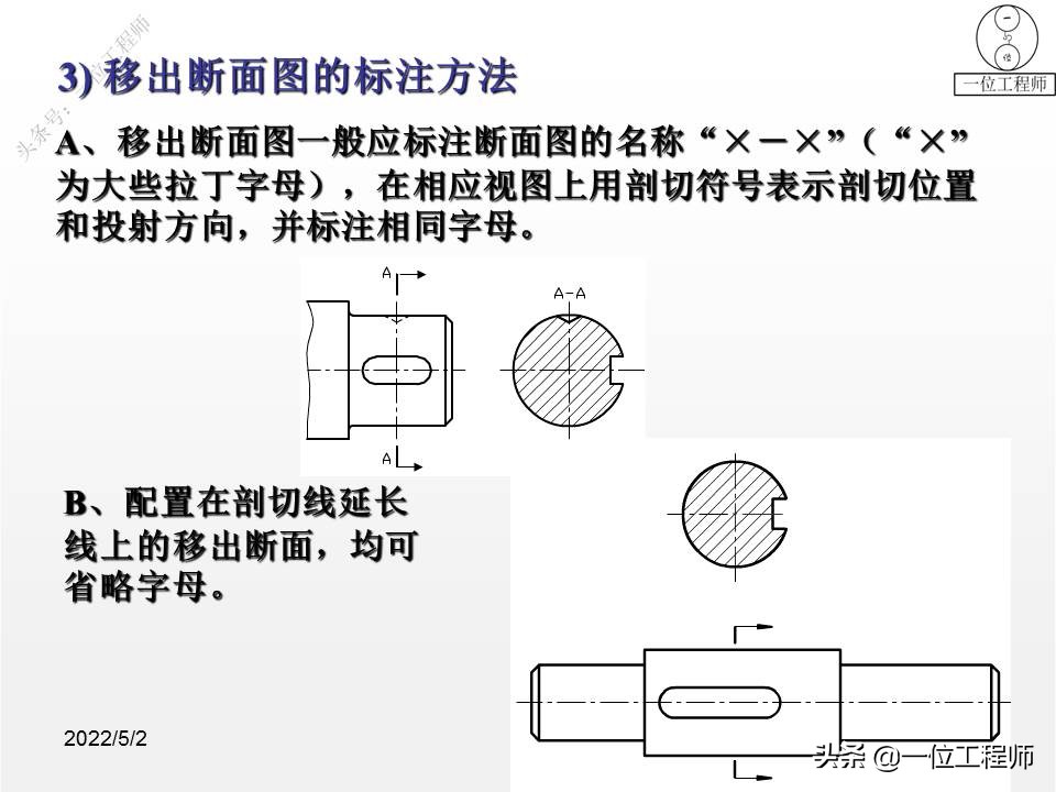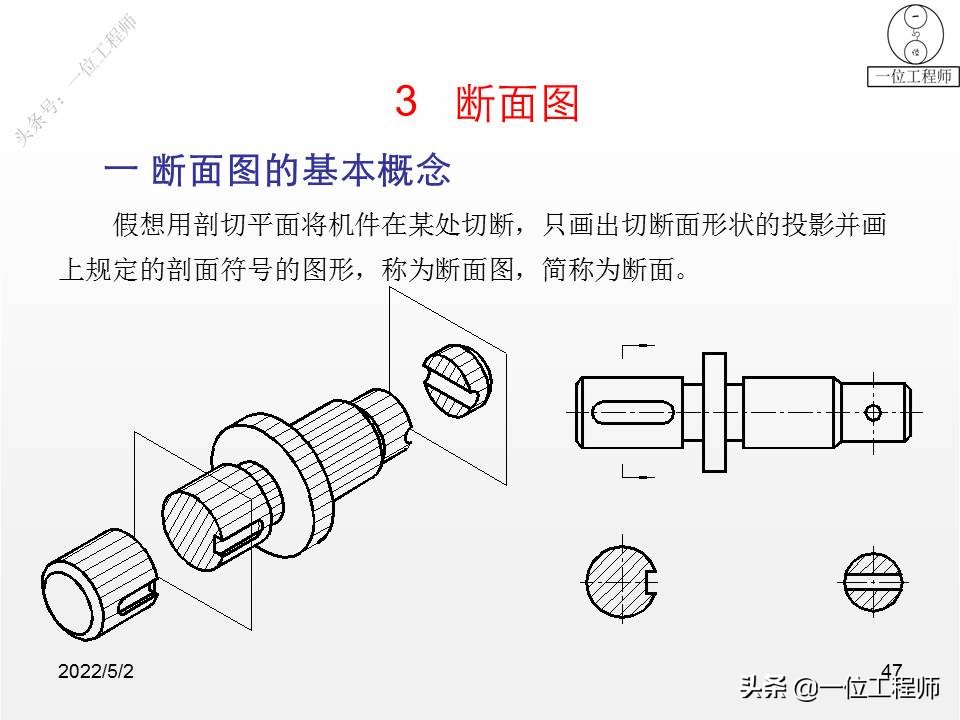 断面图:假想用剖切平面将机件在某处切断,只画出切断面形状的投影并画出上剖面符号的图形,称为断面图,简称为断面。