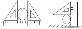 方法1(卡尺法):如左图所示,用直尺和三角板把硬币紧压在桌面边缘;借助两把三角板和一把刻度尺来进行测量。或用一只三角板和一把刻度尺,如右图,用两把三角板紧夹住硬币, 均可从刻度尺上读出硬币的直径d。根据公式L=лd 求出硬币的周长。