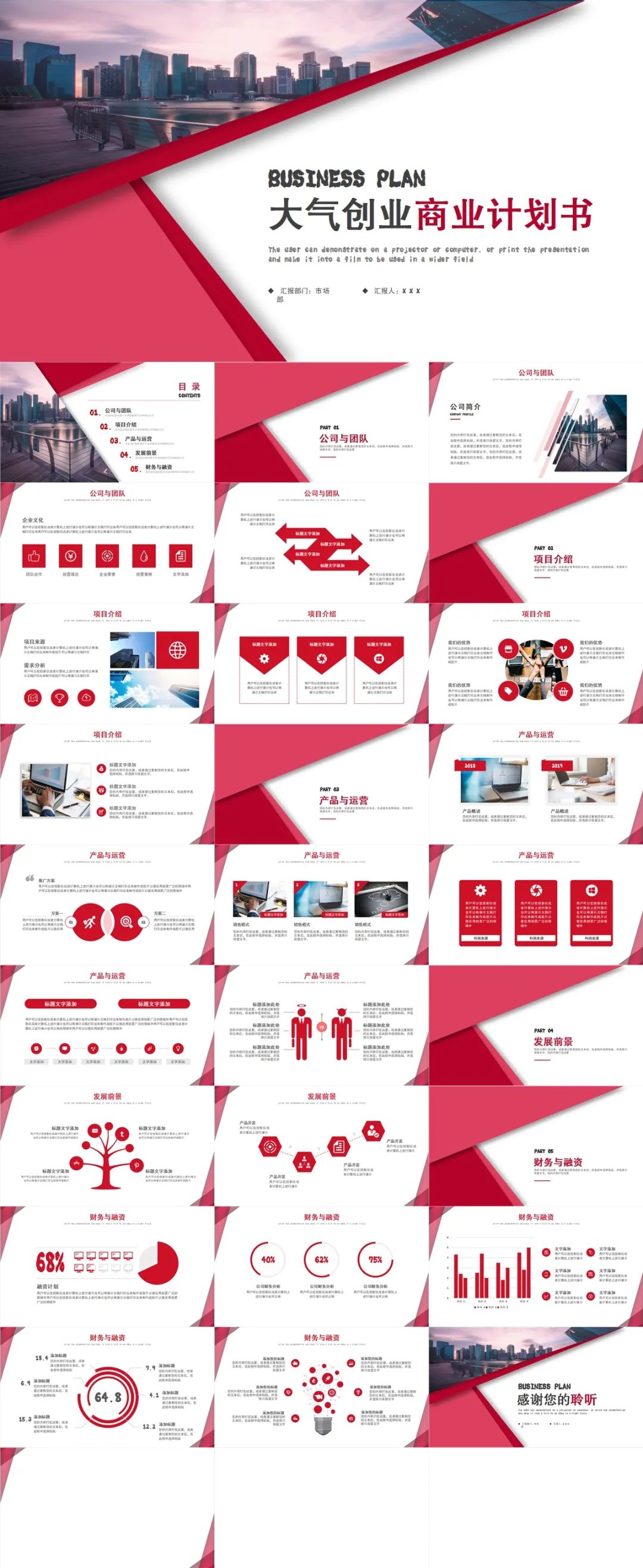 4.部分PPT模板示例如下:大气红公司项目介绍商业计划书ppt模板这套大气红色商业计划书,采用了大面积的高粱红作为主色调,通过几何图形,尤其是三角形的串联,简单的三角形成为整个PPT的吸睛之处,风格很有连贯性