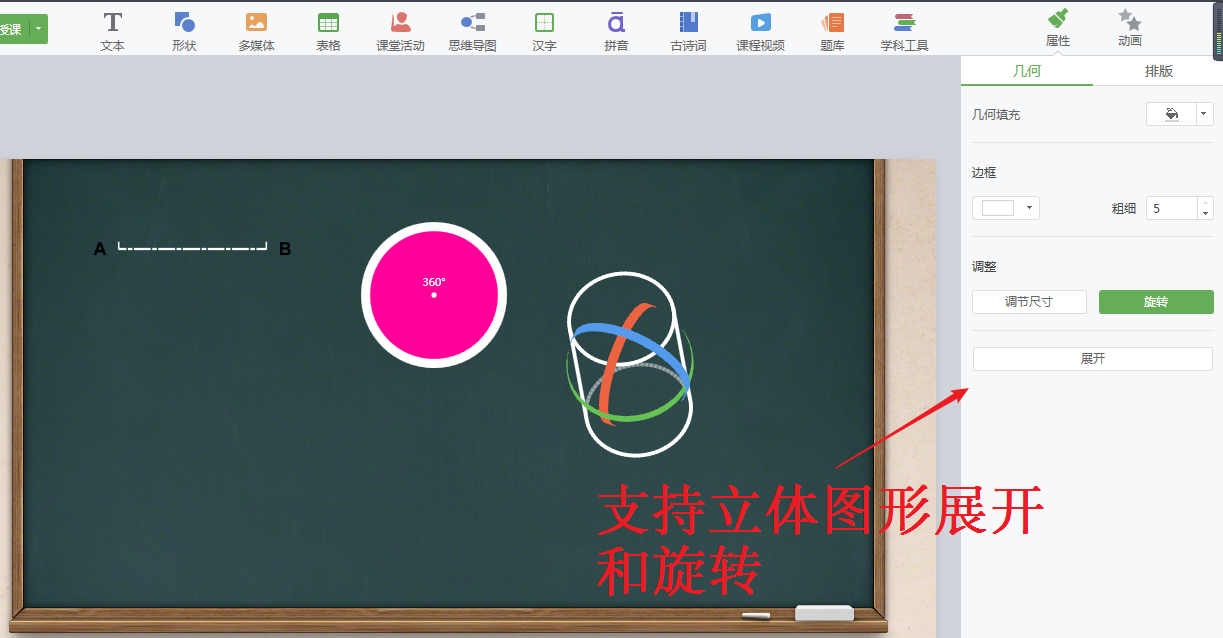 对于立体图形,还支持旋转和图形展开,让学生清晰看到立体图形的平面展开图。