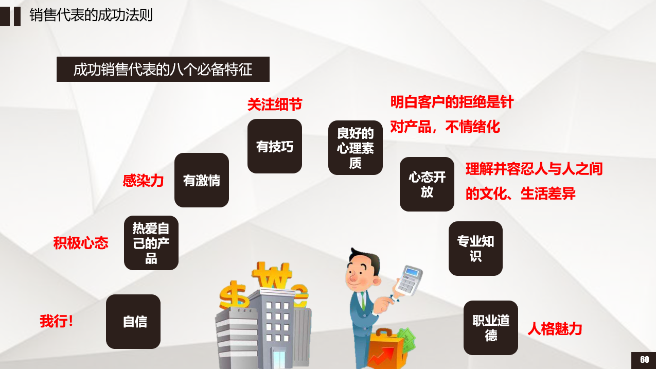 4.请大家点击文章末尾的“了解更多”,在里面找到并关注我,里面有海量各类模板素材免费下载,我等着你噢^^<——非常重要!!!メ大家请看范例图片,商务销售培训课程PPT模板,全内容培训课件,员工教育直接套用。