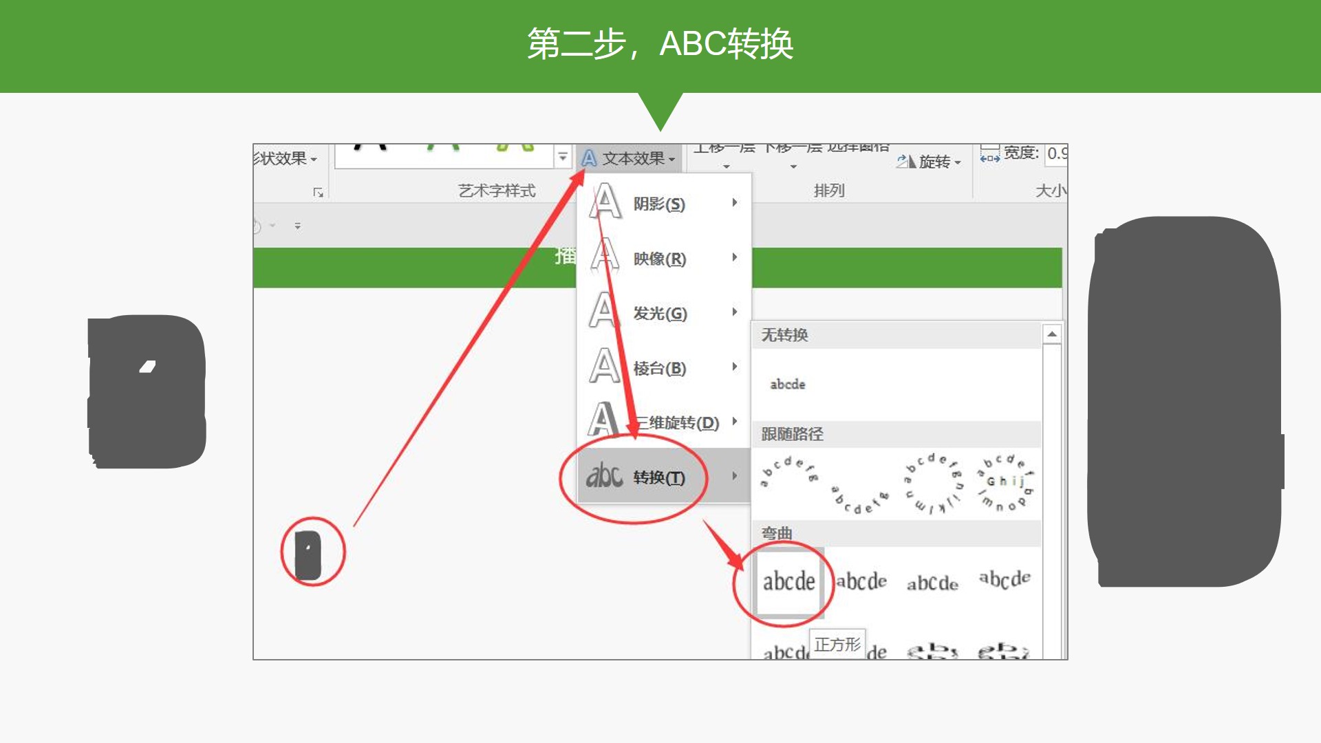 第二步,ABC转换。选中行距设为0的数字,通过【格式】→【文本效果】→【abc转换】→【弯曲】,选择第一个效果。
