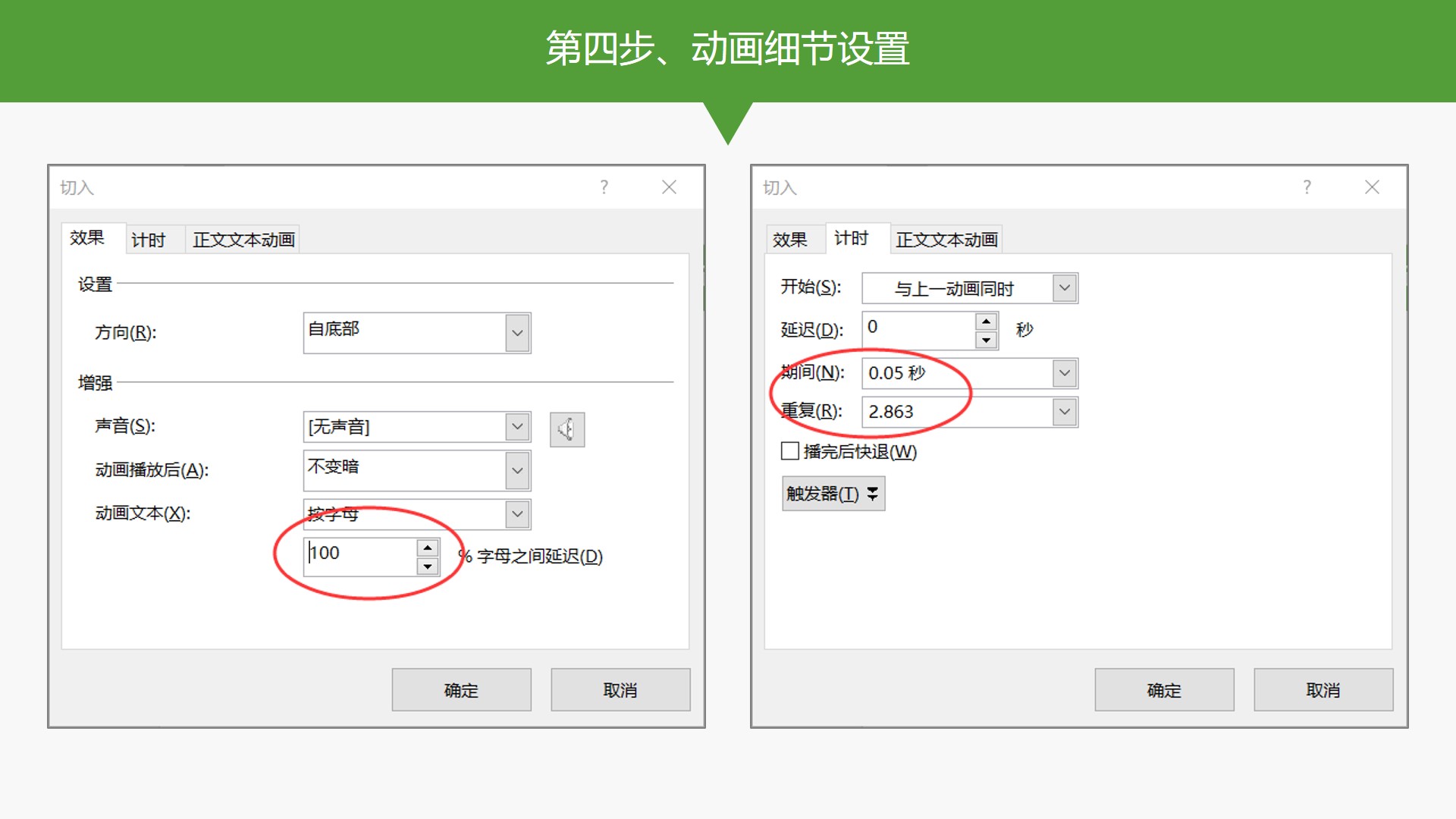 第四步、动画细节设置。合并动画后,在动画窗格中双击动画效果,设置【动画文本】为「100%字母之间延迟」,【期间】为0.05秒,【重复】为2.863次,即实现单个数字的电表箱滚动显示效果。