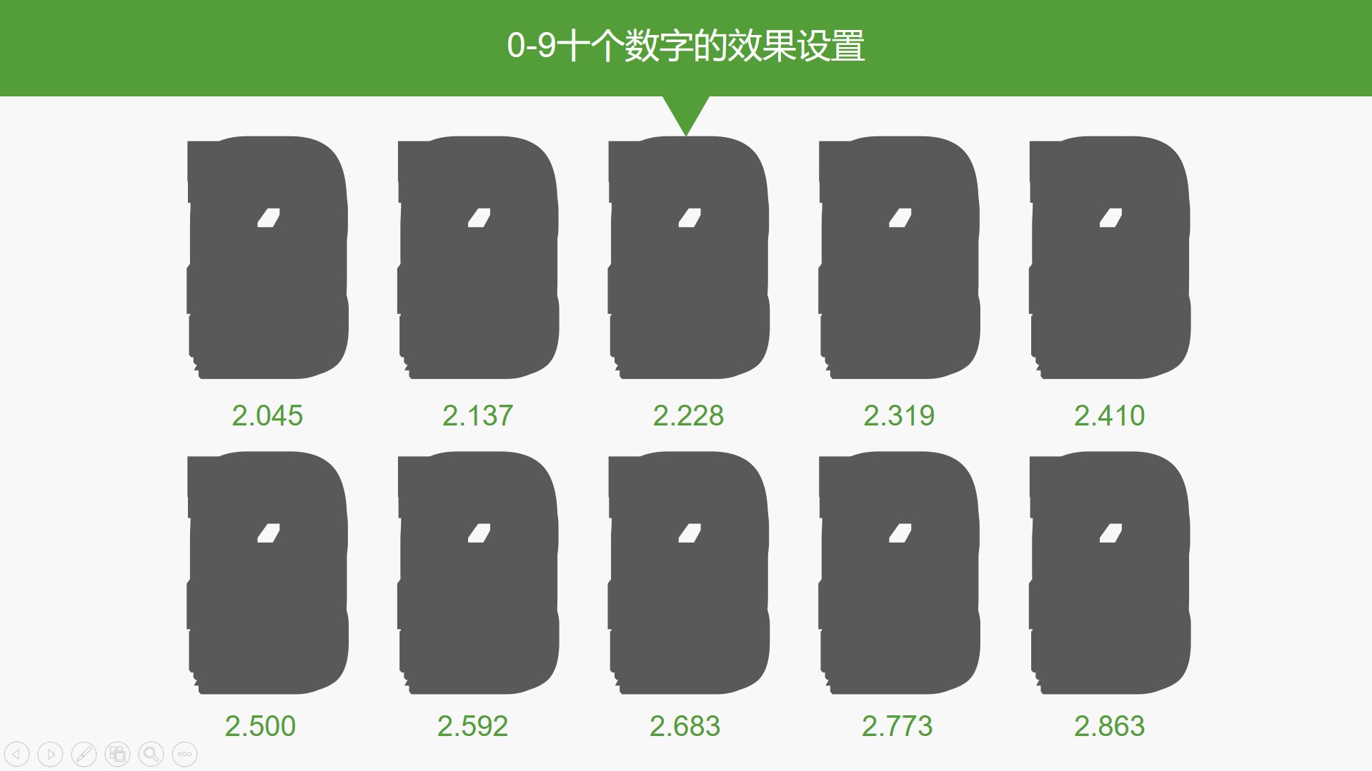 如何根据具体的数值来设置多个数字跳动的效果呢?有两种方法:第一种方法,重新设置行距为单倍,调整数字后,再设置行距为零。那么,如何调整数字呢?原有的数字顺序是0-9时,最终显示的数字是9;我们修改数字顺序是9-8(即9,0,1,2,3,4,5,6,7,8),那么最终显示的数字即是8。为了让不同位数的数字跳动的频率不同,我们可以设置不同的持续时间。