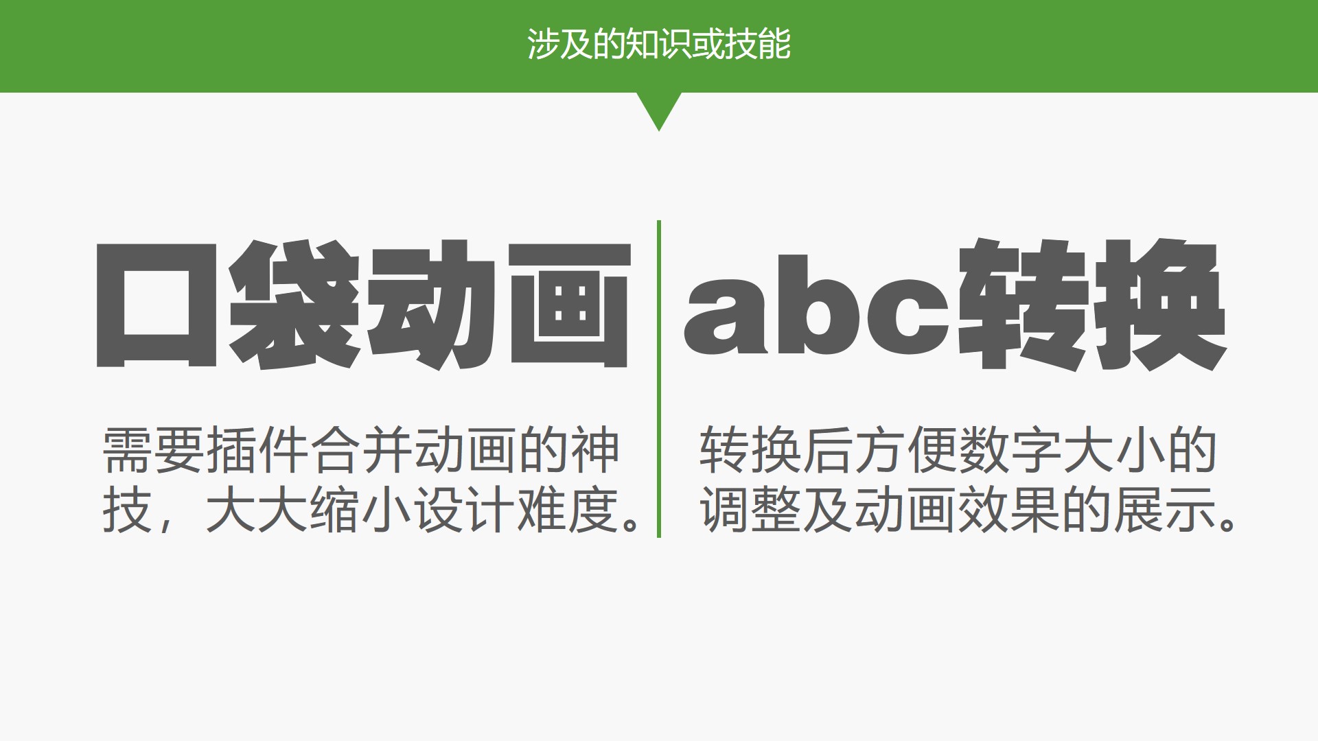 涉及的知识或技能有二:①PA口袋动画插件,需要该插件合并动画的神技,大大缩小设计难度;②文字ABC转换,转换后方便数字大小的调整及动画效果的展示。