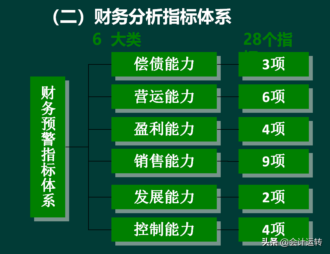 主要分为6大类,28项。例如偿债能力,营运能力,盈利能力,销售能力,发展能力,控制能力等等。