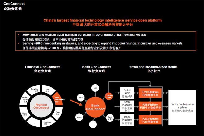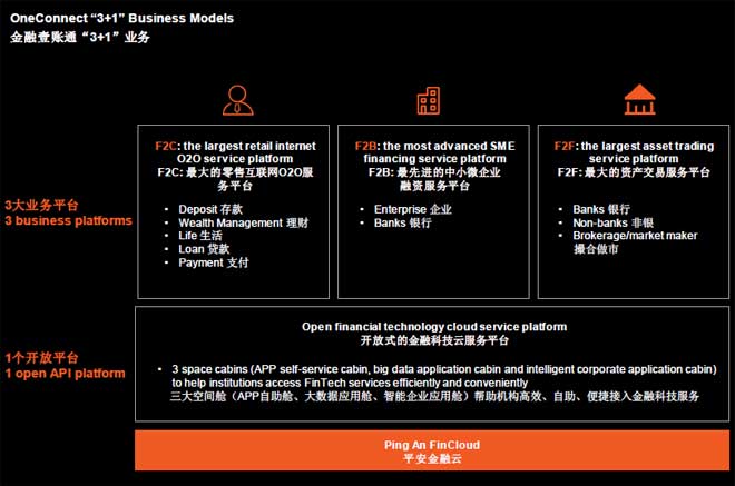 F2C是最大的零售互联网O2O服务平台。平安为银行提供零售银行服务,很多中小银行都在不发达的省份,科技不发达帮助开发移动和线上的银行,这也是业务收入来源之一。