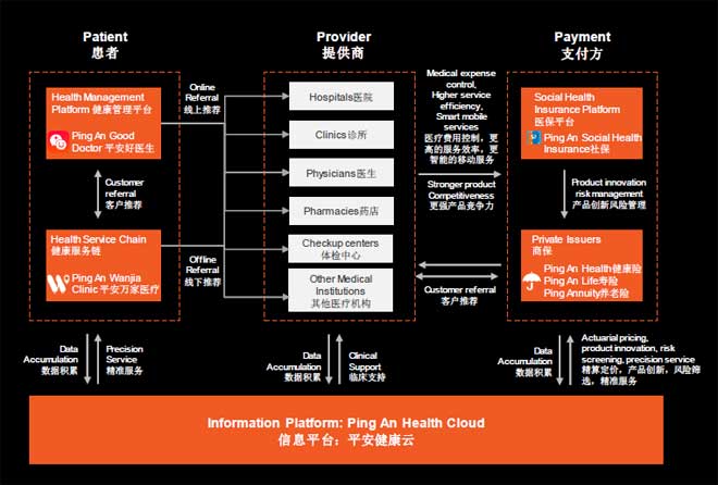 “病人Patient-提供商Provider-支付端Payment”模式。平安医疗健康生态圈的核心是如何管理医疗健康的成本,而目前在中国大部分的费用是社保报销。