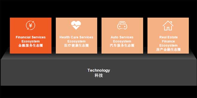 平安的战略是国际领先的个人金融生活服务提供商,这由大金融资产和4个金融生态圈来进行实现。平安致力打造生活科技,即综合金融+互联网或者说互联网+金融/生活模式,房产、汽车、医疗、金融,这是人生中最重要的几个部分。