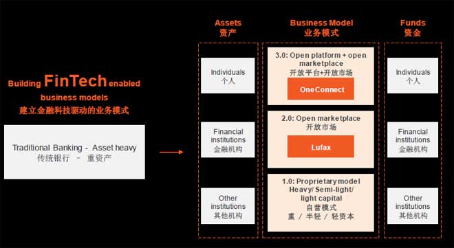 平安将建立金融科技驱动的业务模式,从传统的金融行业的重资产向轻资产转变,通过“自营模式”向“开放平台”再向“开放平台+开放市场”完成资金和资产的链接。
