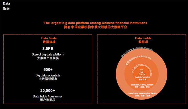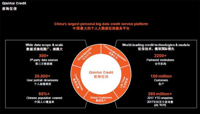 前海征信平台,中国最大的个人大数据征信服务平台,具有数据采集范围广、规模大、征信技术、模型国际领先的特点。全球银行,如汇丰,和中国大银行都在利用前海征信数据,发放和决策贷款。