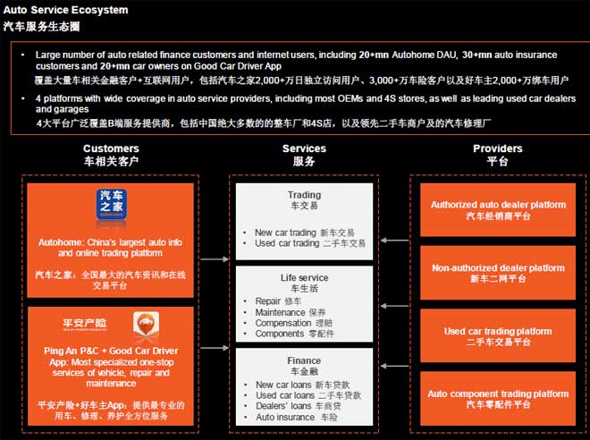 平安同样也提供二手车服务,汽车组建,每年4000亿人民币的业务,通过汽车厂销售和修车厂的方式合作,目前与10万个修车厂合作来改善平台。
