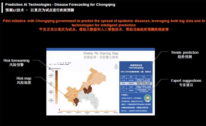 ②预测主要用于医疗方面,在过去几个月中,平安与重庆市政府合作,以重庆为试点,借助大数据和人工智能技术,来帮助重庆政府预测疾病疫情,为政府提供风险预警、风险地图、趋势预测等信息,有助于提高全民健康水平。