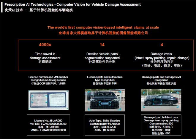 ③在决策方面,平安将人工智能运用于车辆定损。发生事故后,用户拍照上传到软件,平安通过计算机视角,识别车辆信息,包括车型、车牌号,并且将外观分割成了14个部位以用于精准判断车辆损失程度,从而最终确定赔偿金额。
