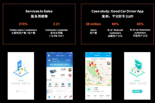 例如平安好车主APP,这是一个一站式的服务APP,一个车主可以在APP上实现他所需要的所有服务,包括加油、修理、交罚单。其中最受欢迎的功能是管理交通罚款单,在中国若把地址填错,则收不到罚单。